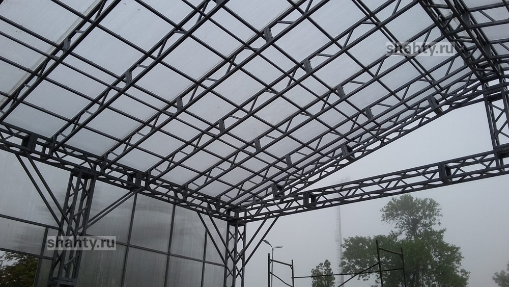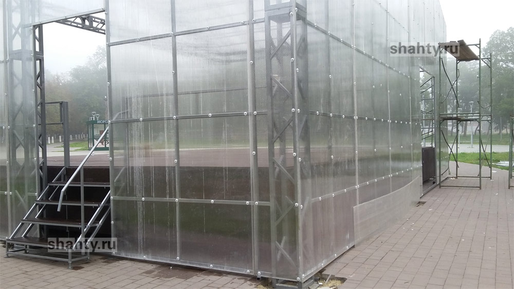 Конструкция выглядит как временная, такие устанавливают обычно для одного мероприятия, а затем разбирают. Сцена плохо продувается, будет душно в теплое время года. Поликарбонат, которым ее обшили, летом будет работать как линза, нагревая внутри воздух.
