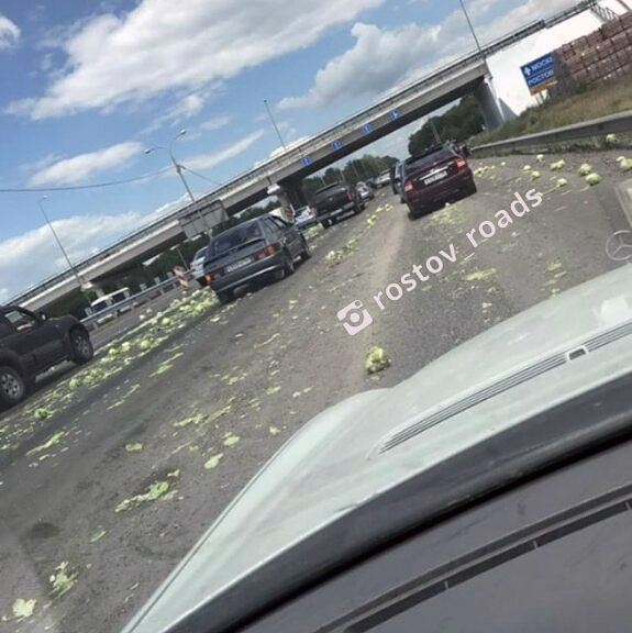 13 июня 2017 г.Фото © rostov_roads instagram.comКурьезное ДТП произошло на трассе М-4 в районе торгового центра «Мега» под Ростовом. Грузовик, перевозивший свежую капусту, рассыпал товар, но водитель большегруза не стал останавливаться и уехал.