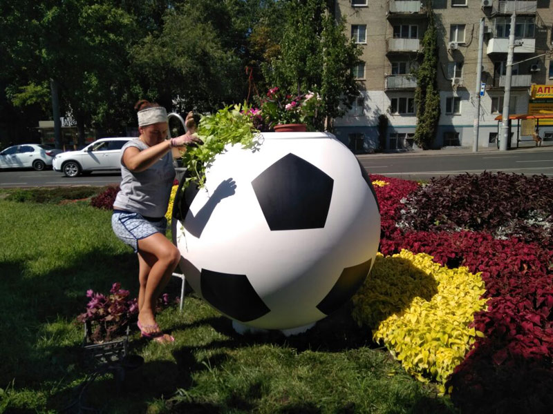 13 августа 2017 г.Ростов готовится к проведению Чемпионату мира по футболу. На улицах города установят 16 форм-цветочниц в виде футбольных мячей. Несмотря на то, что это малые архитектурные формы, мячи выглядят внушительно.