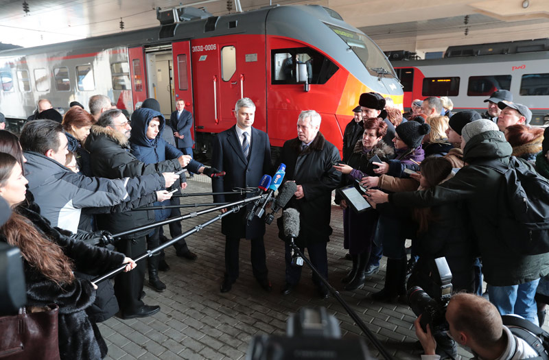 14 марта 2018 г.На прошлой неделе в Ростовскую область поступили первые два новых электропоезда. Сегодня, 14 марта, на главном железнодорожном вокзале Ростова-на-Дону электрички ЭП3Д осмотрели губернатор Василий Голубев и гендиректор ОАО «РЖД» Олег Белозеров.