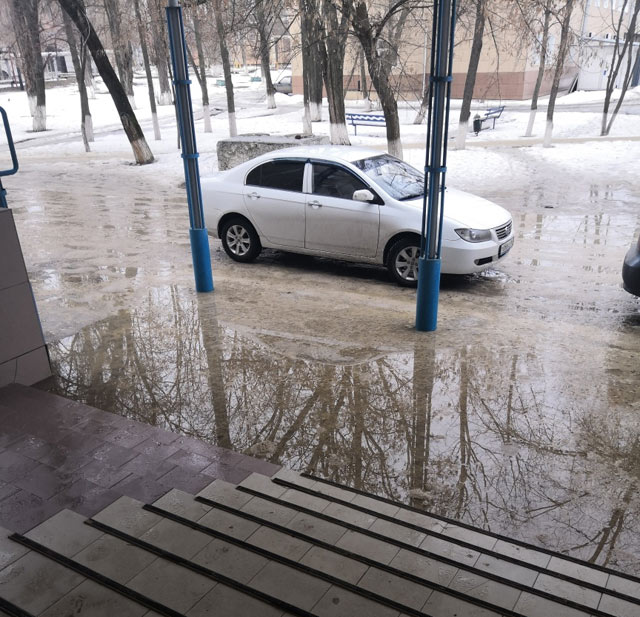 13 февраля 2019 г.В Шахтах к гололеду добавилась другая проблема. Началась оттепель и в низинах в лужах на льду стала собираться вода.