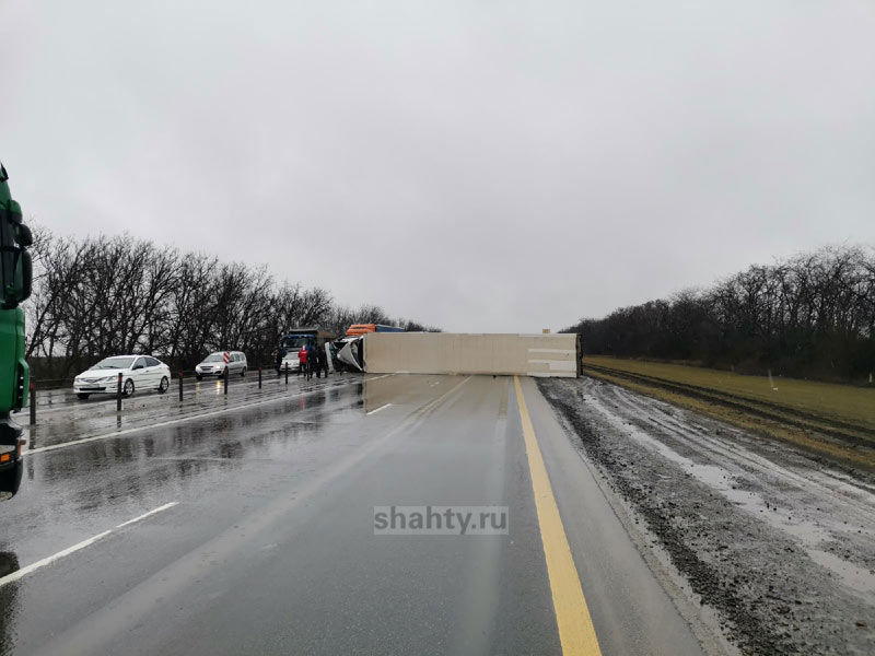 На мокрой трассе под Шахтами опрокинулась на бок фура с прицепом. Большегруз полностью перекрыл движение в сторону Ростова, заняв обе полосы. Очевидцы советуют ехать в Ростов через Новочеркасск.