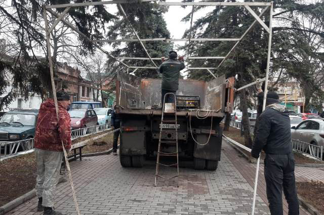 В последние дни в городе Шахты устанавливают декоративные конструкции. Каркасы световых арок и тоннелей появились в центре города на проспекте Клименко. Места размещения все те же. Очевидно и светодиодные украшения будут прошлогодними.