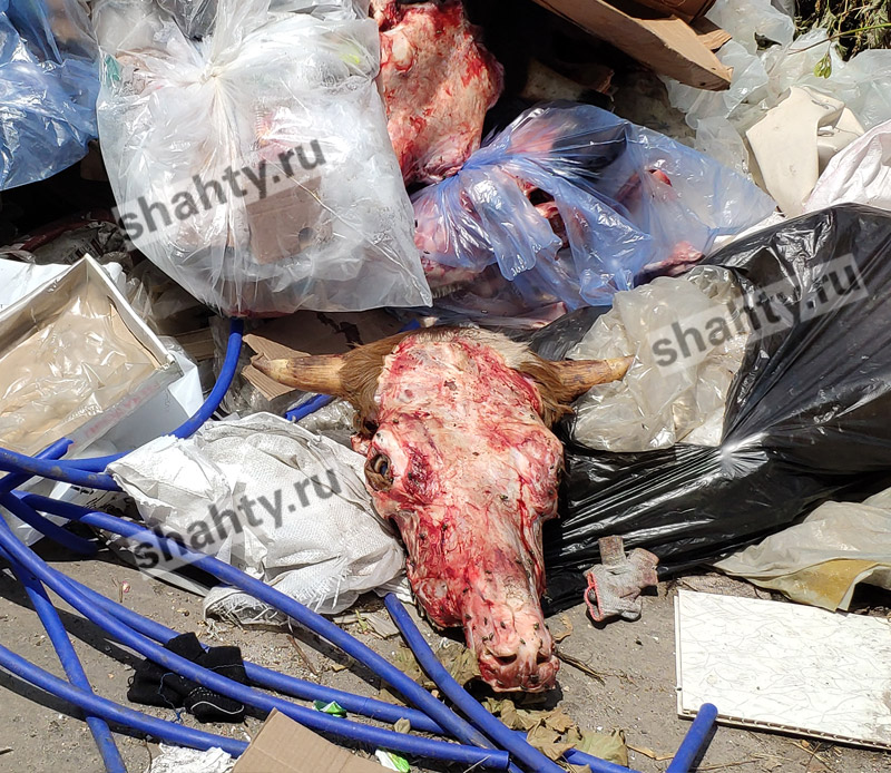 Это уже не в первый раз. Гниющие коровьи черепа теперь «радуют» своим видом взрослых и детей из близлежащих домов. В воздухе стоит запах гниющей плоти с площадки с мусорными баками, а неподалеку играют дети. Не так давно в этом месте на дороге лежала коровья шкура, которую из мусорной кучи вытащили стаи собак. Животные обитают рядом на оптовой базе.