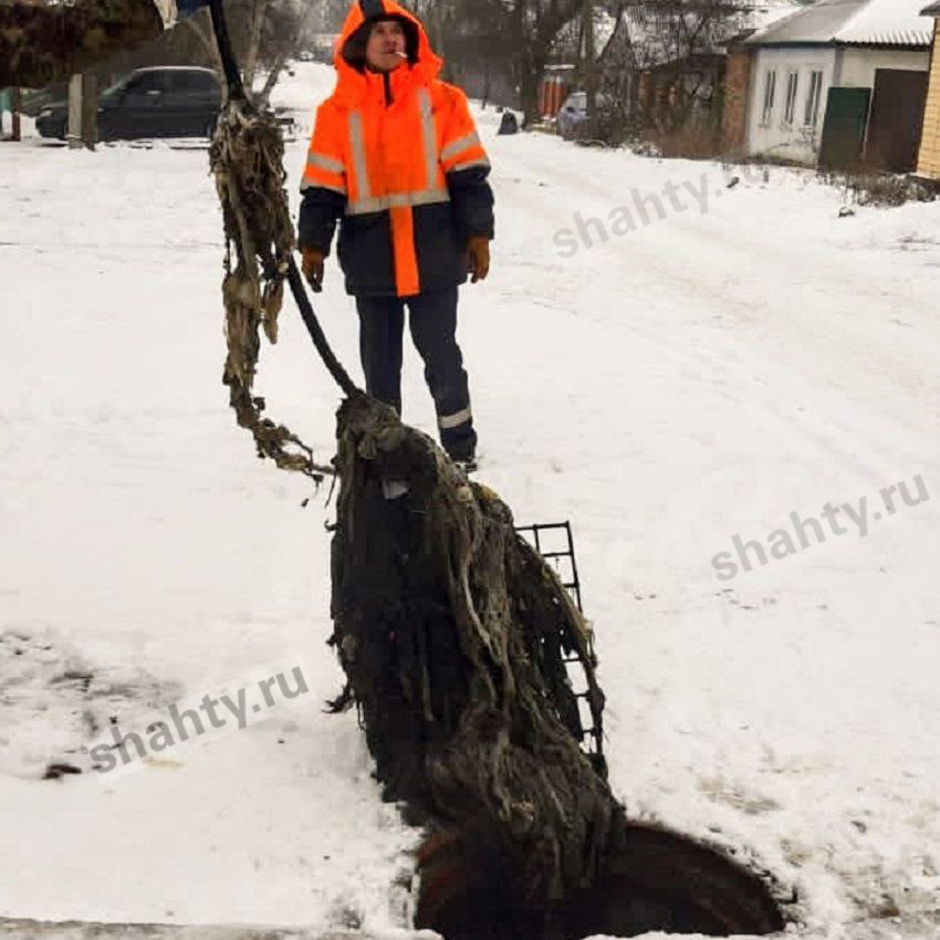 Плановые работы выполнялись вручную, с помощью сантехнических тросов, ловушек и сноровки. Спецтехника при таких засорах не поможет, рассказали в Шахтинском водоканале.